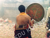 The hand drums of the dancers which are the ones that inflicted the acts of self-torture are thin and round as a fan (fig. 7). They are made of goat skin ornamented with the figure of the dragon among others. The purpose of the drums is not for producing music but it is rather for allowing the sound or voice of the spirits to come out as it is thought that the animal spirits are carried within it. Thus calling the gods to them.