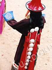 Both male and female dancers wear a red tall hat. These hats represent Mt. Meru (Tib. Ri-rab), the central mountain or axial centre of the universe within both Hindu and Buddhist cosmography.