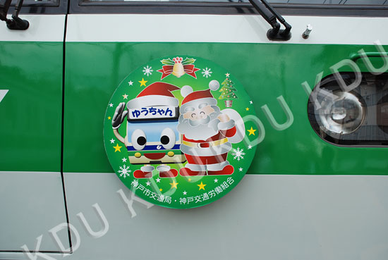 「より市民の皆様に密着した地下鉄に」をテーマにクリスマスイベントの一環として実施。神戸市営地下鉄のクリスマスデコレーションは以前から実施されていたが、しばらく中断していた。今回は数年ぶりに実施することとなり、主催者からの依頼で近隣幼稚園と神戸芸術工科大学が制作協力することとなった。私は前述の「ペイントバス」を実施した経緯から、交通局関係者の紹介で直接連絡があり、担当することとなった。制作したシートは電車内のガラス窓に貼り付けられ、電車の前後の先頭部にはクリスマスヘッドマークが取り付けられた。(図13、14、15)なお神戸市営地下鉄では同様のデコレーション企画として「七夕~ひこぼし号、おりひめ号」などを実施している。