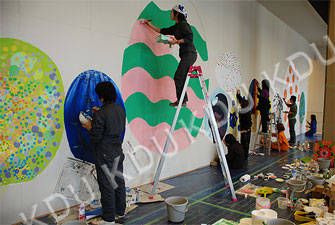 大ホールのアスベスト除去工事(2007年11月10日~2008年3月末)のため設置された工事壁(高さ4m横幅13m)に壁画を制作する事業。施設入口の正面に設置された工事壁がとても大きかったことから、工事期間中のイメージを和らげるとともに、来場者に一層親しんでもらうことを目的に壁画制作を企画。私は主催者から相談を受け、全体テーマと画面構成を提案。主催者とのミーティングの中で、阪神淡路大震災のあった1月17日「震災の日」を、芸術で元気にしていくことも重要な目的となった。制作には造形表現学科造形美術専攻の2年生9名と小野裕子助手が参加することとなり、画面構成の詳細を調整しながら進めることとなった。壁画は、大小11個の卵を作図し、制作参加者11名が各自1個をアクリル絵具で彩色し、仕上げられた。(図18、19)