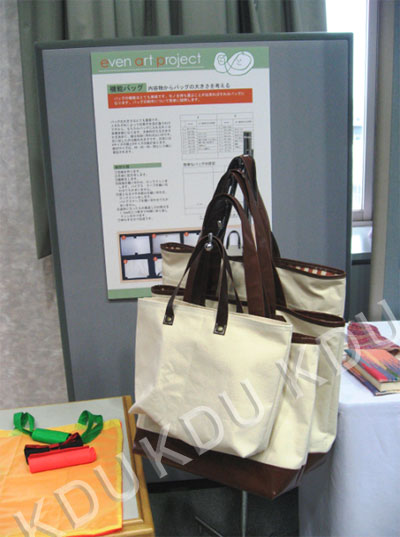 本学では、全体研修・スキルアップ講習会講師・プロダクト100の小規模作業所への提案-デザインビジネスのモデル提案-を見寺貞子、プロダクト100の展示企画案を瀬能徹、プロダクト100の小規模作業所への提案-アートビジネスモデルの提案-を谷口文保・小野裕子、プロダクト100の小規模作業所への提案-デザインビジネスのモデル提案(ラッピング)-を石崎真紀子UDアドバイザーが担当、ファッションデザイン学科の学生10名(井上貴博、金子哲、迫田恵美、水谷芙木、森實小百合、藤田美佳、越智英雄、鳥居さおり、上村理美、土井恵美)もプロダクト100の内容に関してデザイン提案を試みた。その内容について以下に示す。