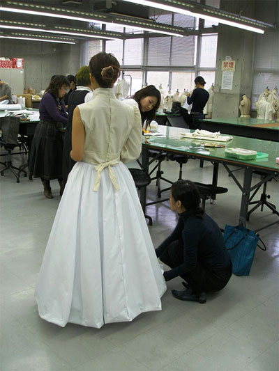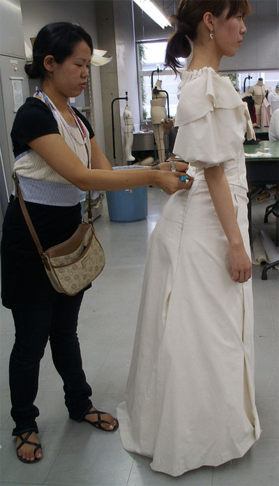 一度に仮縫いは困難である。出演者のスケジュールと調整しながら仮縫いの日を設定した。1回目は夏休み終了直後9月29日、モデルに学内に来ていただきトワルで仮縫いを開始。舞台衣装という特殊な衣装を本格的に制作するのは、学生たちにとっては初めての挑戦である。デザイナーや芸術監督たちを交えての入念なチェック。シルエット、ボリュームなどを考慮し、舞台上で出演者が衣装でいかに大きく見せられるか、また、顔を小さく見せるには胸元のディティールをどう工夫すればよいか、素早く着せ替えるにはどういう始末がいいか等々。細かな心使いで数えきれない箇所を検討した(写真16)(写真17)(写真18)(写真19)(写真20)(写真21)(写真22)(写真23)(写真24) (写真25)(写真26)(写真27) (写真28)(写真29)(写真30) (写真31) (写真32) (写真33)。