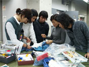 2008年1月18日(金)は、リハーサルである。学生たちは早朝から会場に集合し、役割担当別に作業を開始した。スタッフ間の連絡、衣装の修正やまとめなどを行い、学生たちはてきぱきと作業にあたった (写真58)(写真59) (写真60) (写真61)。