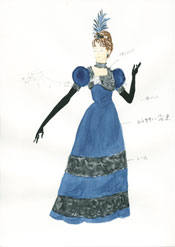 オペラという舞台上で、出演者の役柄を表現する衣装の素材を選定するのは時間のかかることである。選定はデザイン画の打ち合わせ後、デザイナーとともに大阪にて素材を収集した。購入は、パターン修正後必要用尺を発注、スカートなどひとつのパターン容量が大きく想像以上に用尺が必要となった。それぞれの使用箇所をパートにわけ、素材帳を作った。これが後々にも大変役立った。また、副素材を用いることにより、より一層の役柄に近づいた(図13)(図14)(写真34)。