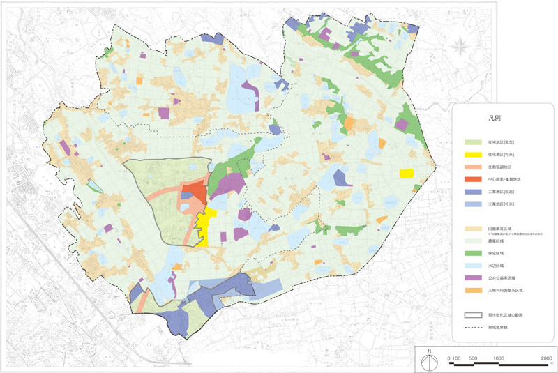 そして、現況分析の結果と将来目標とを照らし合わせつつ、それぞれの区域の配置について検討を行った結果を、下に示す土地利用方針図としてとりまとめた。