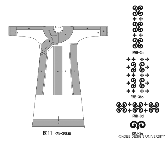 - 全体の文様は主にRWB-3aのような文様が直立に、あるいは横に連続配置されている。また、RWB-3aの文様を二つに分け、RWB-3bcのような花の文様を取り入れながら、逆方向に配置する方法も見られる。またRWB-3eのような具象的な蛇の文様もある。この服に見られた文様はいずれも蛇の形態を象ったものであり、ルカイの伝統的な信仰観念が表現されている。