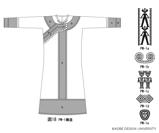 - PW-2abのような文様を主要とする。奇怪な表現造形は宇宙人を連想させる。上下に正反を配し合体している形がこの服の上にいっぱい使われている。祖霊の信仰観念に基づいて作られたものであるのか、今後、分析を進めていく必要がある。PW-2cdの人形紋が一列に並んでいるのは、伝統服を着用しているかつて生活風景を描写しているものであると考えられる。