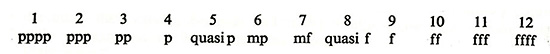 基本となる1つの音高セリーは、一定の演繹操作によって合計48の派生形となり、それぞれに音価、強度、アタックのセリーが組み合わされて実際の「音素材」が形成される。この様に演繹的に準備したセリーを素材として並べることによって単純明快な構造をしており、きわめて機械的なやり方で組み合わされることにより、作曲者はそこに非主観的に関与するのみとして、これが作曲されるのである」(*27)と説明されている。(図11)